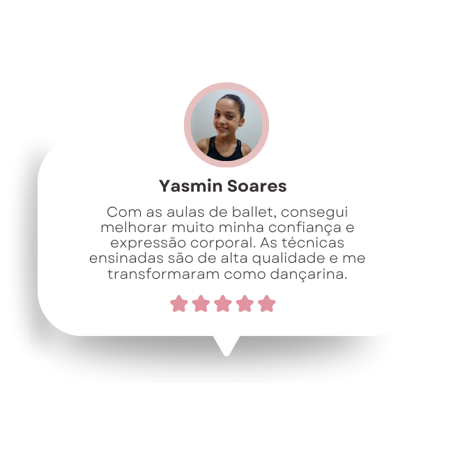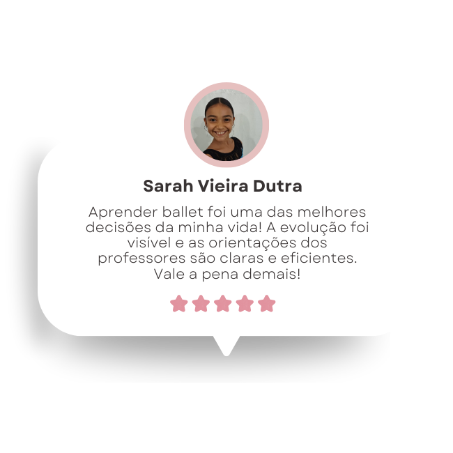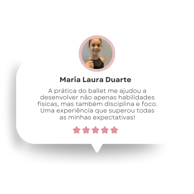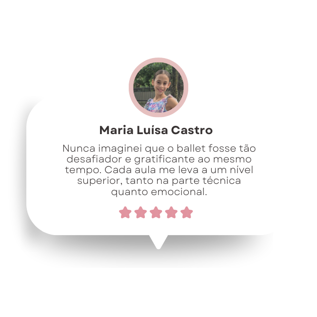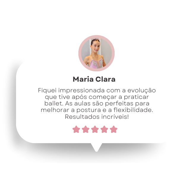 Sou Maria Clara, aluna online da Escola Germana Saraiva, e sou apaixonada por essa experiência! Faço aulas cinco vezes por semana, em grupo e individuais, com um suporte incrível. Mesmo morando em outra cidade, consigo evoluir sem comprometer meu aprendizado. As aulas online facilitaram minha rotina, permitindo que eu me desenvolvesse com qualidade e disciplina. Recomendo de coração, pois a escola oferece todo o suporte necessário para nossa evolução no ballet!
